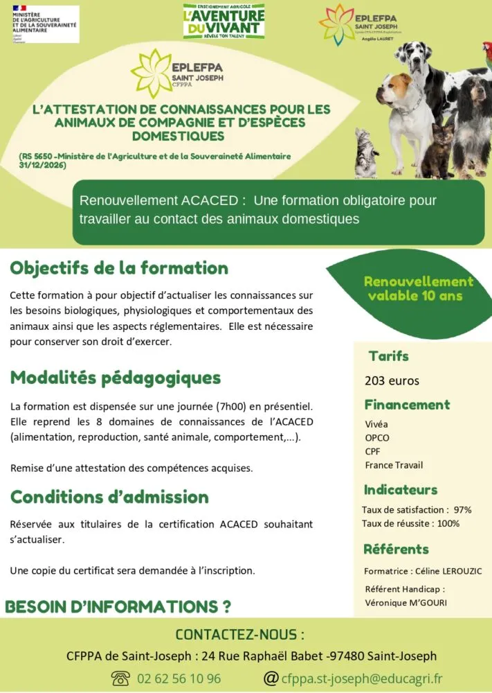 Le CFPPA de Saint-Joseph annonce l’ouverture des inscriptions pour le renouvellement de l’ACACED (Attestation de Connaissances pour les Animaux de Compagnie d’Espèces Domestiques). Cette session, d’une durée de 7 heures, débutera le 8 septembre 2025 et comptera 15 places disponibles.