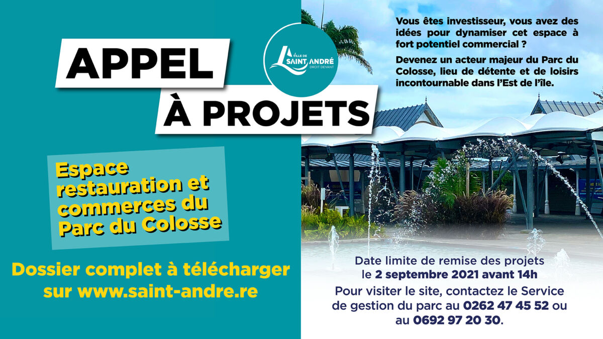 Le Maire de Saint-André, Joé Bédier et son équipe municipale lancent un appel à projets visant la création d’une offre de restauration et de commerces variés au Parc du Colosse. Cet appel s’adresse aux investisseurs privés (déjà établis ou non) porteurs d’un projet viable pour ce lieu à fort potentiel commercial. La Ville souhaite construire une véritable offre de détente à destination de la population saint-andréenne et réunionnaise. L’objectif est de dynamiser ce parc de loisirs à fort potentiel pour qu’il réponde aux attentes de toute la population.
