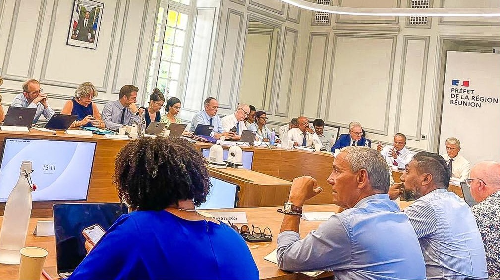Je ne vais pas revenir sur les violences en bande et le plan de lutte mis en place par le préfet pour en venir à bout. Suite à la montée au créneau des élus, les pouvoirs publics semblent durcir le ton. La justice ne fera plus de cadeau aux fauteurs de troubles en général et à ceux qui « importent » ces violences en bandes, en particulier. Comprenne qui pourra ! Il n’y a qu’à voir le verdict rendu en comparution immédiate par la justice dans une affaire de violences impliquant des délinquants : prison ferme ! Sans compter que la CAF examine actuellement une vingtaine de dossiers relatifs aux familles hébergeant des mineurs isolés délinquants. L’Etat ne plaisante plus ! J’ai bien aimé le plan de table. Je ne sais pas s’il résulte de l’ignorance du service de protocole de l’Etat ou d’un « foutan » de la part du préfet, du genre « vous souhaitez lutter contre les violences importées, les violences en bandes, commencez déjà, localement, par faire la paix entre vous, les élus ! » Comme vous pouvez le voir sur la photo ci-dessus : Joé Bédier, maire de Saint-André et Patrice Selly, maire de Saint-Benoit et président de la Cirest, ont été placés cote-à-cote. Durant la réunion, Bédier a regardé à gauche et Selly a regardé à droite. Attention au torticolis !