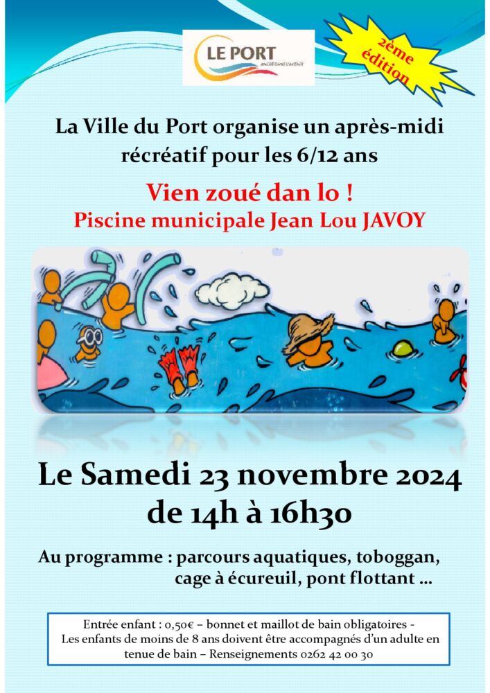 La Ville du Port propose une belle occasion de détente et de jeux pour les enfants de 6 à 12 ans, ce samedi 23 novembre 2024, de 14h à 16h30, à la piscine municipale Jean-Lou Javoy.