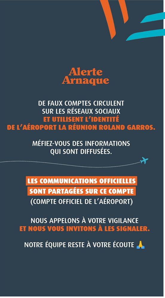 L’aéroport de La Réunion Roland Garros appelle à la vigilance face à la prolifération de faux comptes sur les réseaux sociaux. Ces comptes utilisent l’identité de l’aéroport afin de diffuser des informations trompeuses, susceptibles d’induire les voyageurs et le public en erreur.