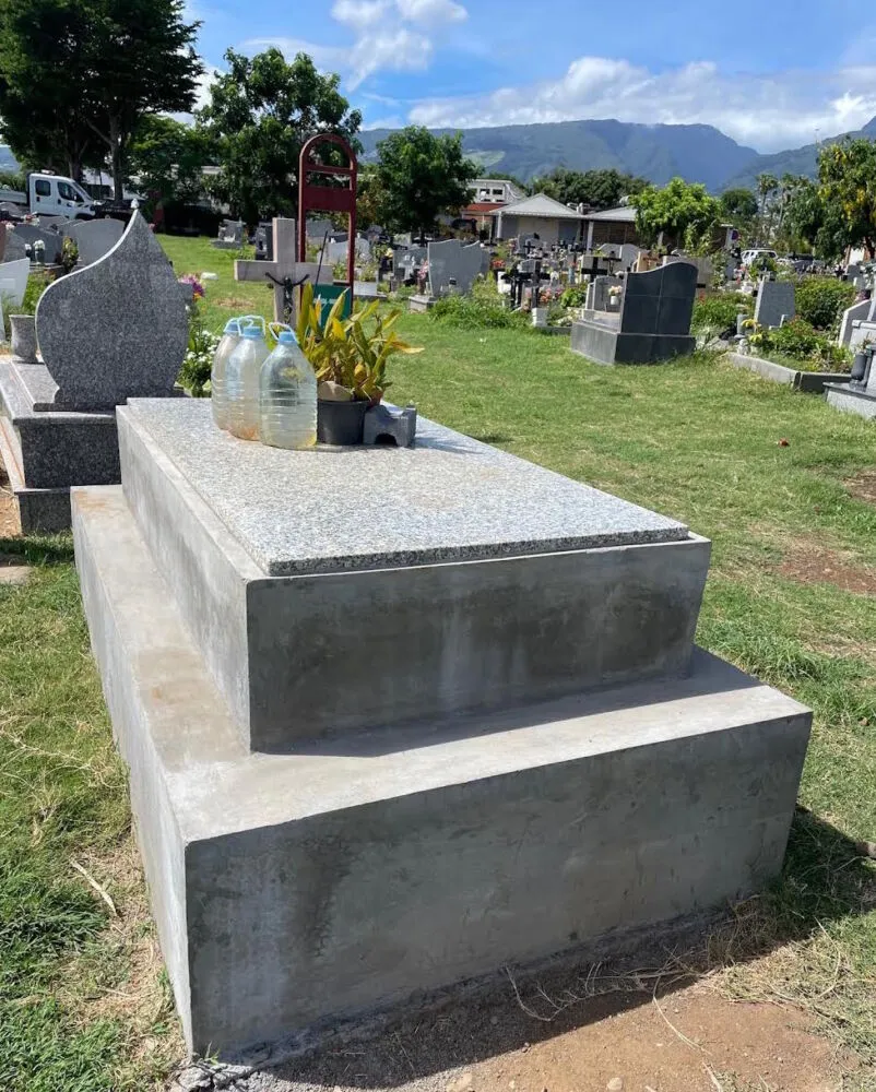 Voici ce le caveau que cette société du Moufia lui avait livré pour 10 000 € au cimetière de Primat à Saint-Denis : un bloc de béton brut recouvert d’une plaque de marbre d’occasion « volée au cimetière de l’Est par l’entrepreneur, un escroc déjà condamné dans une autre affaire par la justice mais qui sévit encore », insiste M. Adelin.