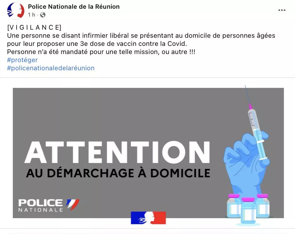 « Une personne se disant infirmier libéral se présentant au domicile de personnes âgées pour leur proposer une 3e dose de vaccin contre la Covid.Personne n’a été mandaté pour une telle mission, ou autre !!! »
