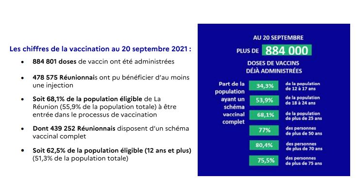 Au 20 septembre, 62,5% de la population éligible dispose d’un schéma vaccinal complet. La couverture vaccinale continue sa progression lentement puisque 31,9% des Réunionnais éligibles ne sont pas encore entrés dans le processus de vaccination.