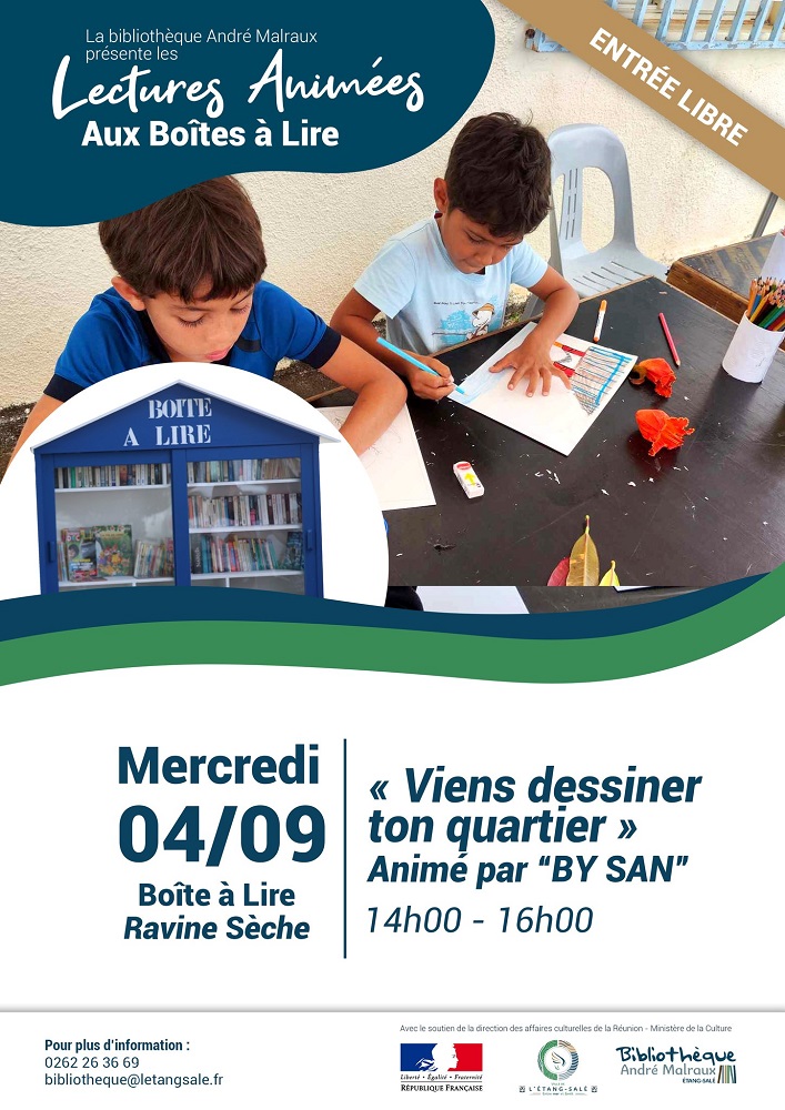 Ce mercredi 4 septembre, la bibliothèque de L’Étang-Salé invite petits et grands à participer à l’atelier « Viens décorer ta Boîte à Lire ». Rendez-vous à la « Boîte à Lire » de la Ravine Sèche de 14h00 à 16h00 pour laisser libre cours à votre créativité. Cet événement s’inscrit dans une série d’animations hebdomadaires organisées par la bibliothèque chaque mercredi. Venez nombreux pour embellir cet espace de partage et contribuer à la vie culturelle de votre commune !