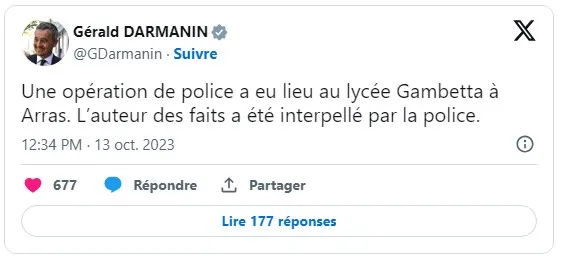 « Trois ans après l’assassinat de Samuel Paty, Dominique Bernard, professeur de Français, a été tué ce vendredi au lycée Gambetta d’Arras et 3 autres personnes ont été gravement blessées. Cette acte barbare a une nouvelle fois choqué toute la nation. La République par l’école véhicule des valeurs de liberté, d’égalité et de fraternité. Une nouvelle fois c’est le principe de laïcité et les valeurs de la liberté qui ont été touchés !