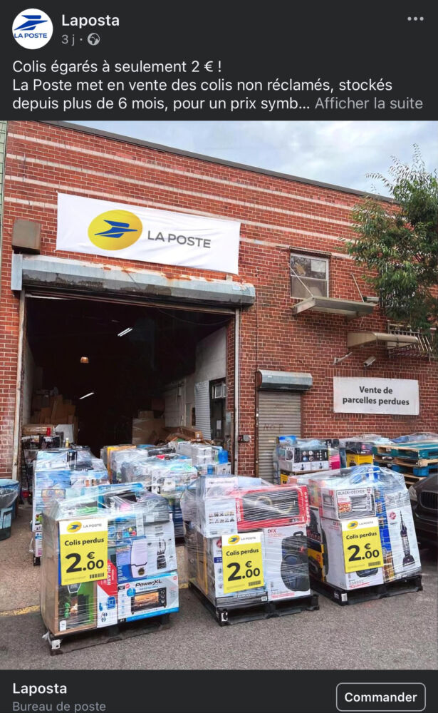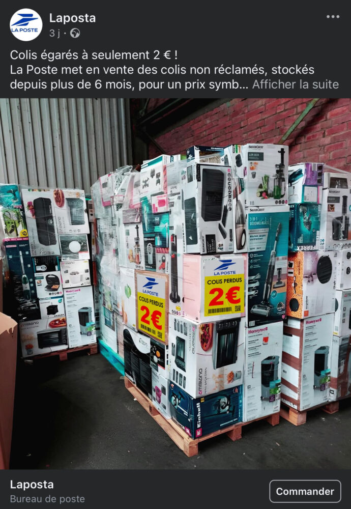 Le groupe « La Poste » ne procède jamais à la vente de colis non réclamés via des annonces sur les réseaux sociaux de META(Facebook et Instagram).