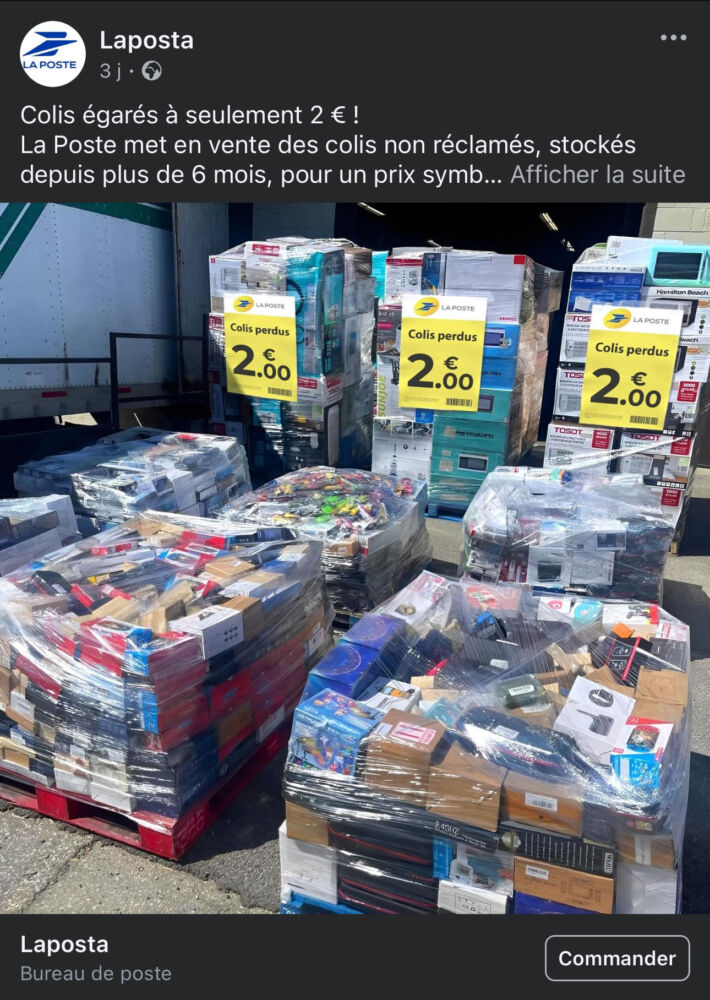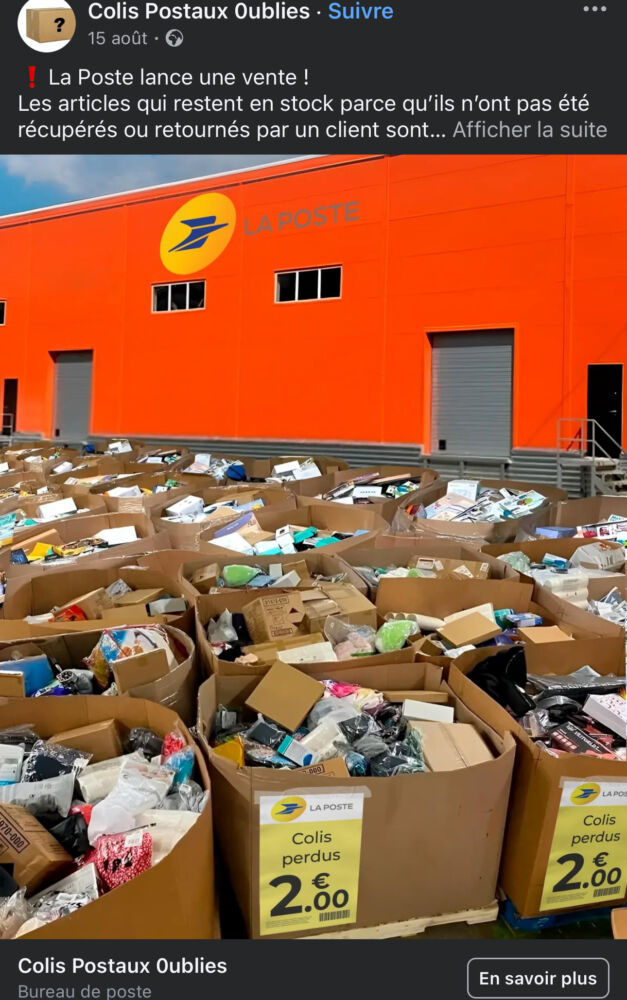 Car attention, Le groupe « La Poste » ne vend pas de colis non réclamés. Des escrocs font circuler de fausses annonces prétendant que La Poste met en vente des colis qui n’ont pas été récupérés par leurs destinataires.