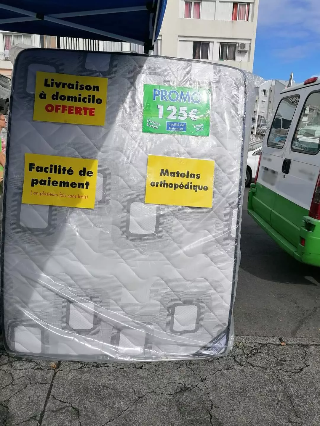 Dimanche matin j’ai été au marché forain de Saint Denis, je tombe sur un petit stand qui vend des matelas. 125€ avec livraison, soit disant matelas orthopédique.. je bien insisté sur le prix, c’est bien 125€ le matelas!!!