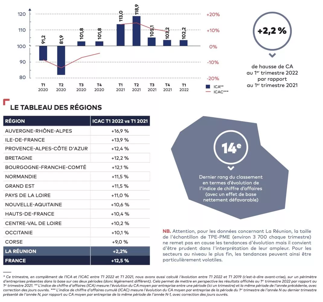 - Au 1er trimestre 2022, le chiffre d’affaires (CA) des TPE-PME de La Réunion a progressé de 2,2 %, malgré les mesures de restriction et un couvre-feu mis en place entre le 1er janvier et le 28 février. Si ce résultat place le territoire au dernier rang du classement national, il convient de noter qu’il est comparé à celui du 1er trimestre 2021 lors duquel l’activité des structures réunionnaises avait fortement rebondi (+13 %), entrainant un effet de base défavorable.