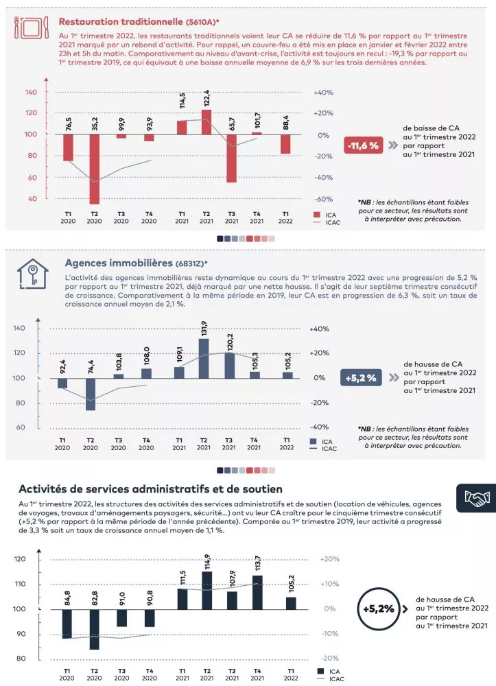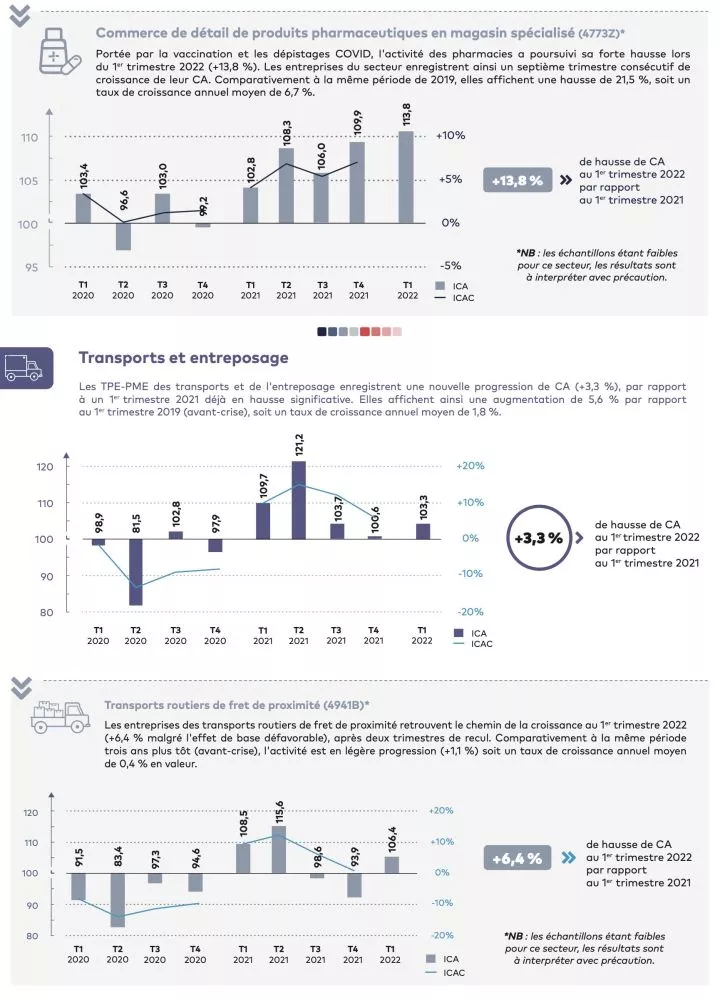 - La comparaison avec les résultats du 1er trimestre 2019* permet de connaître l’évolution du CA des petites et moyennes structures de la région par rapport à un niveau d’activité d’avant-crise. Leur CA a progressé de 7,1 % par rapport à la même période trois ans auparavant, ce qui équivaut à un taux de croissance annuel moyen en valeur de 2,3 %, contre 3,5 % au niveau national.