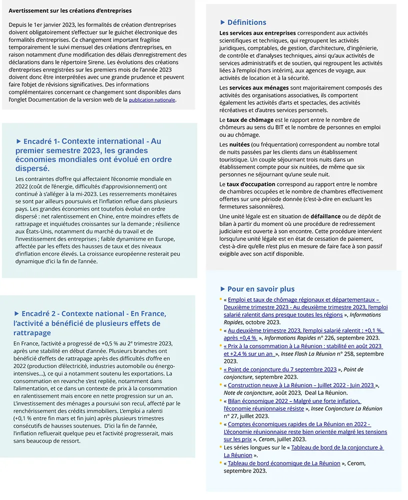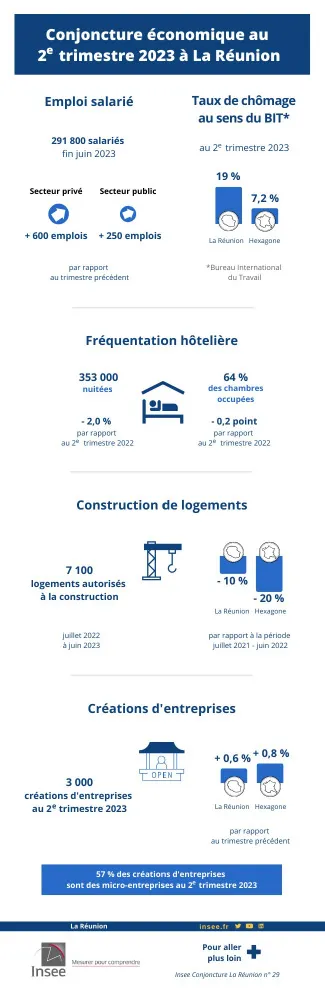 Au deuxième trimestre 2023, le ralentissement de l’emploi se confirme : alors que 1 600 emplois salariés étaient créés chaque trimestre en 2022, seuls 800 emplois sont créés au deuxième trimestre 2023, après 500 emplois créés au premier trimestre. Le secteur privé cesse en effet de porter la dynamique de l’emploi observée en 2022. Le commerce et les services aux entreprises sont ainsi les rares secteurs qui créent des emplois ce trimestre. Les constructions de logements et la fréquentation touristique ralentissent. Les créations d’entreprise restent stables alors que les défaillances augmentent. Tout comme au premier trimestre, l’emploi croît légèrement dans le secteur public, après une année 2022 plutôt marquée par des destructions d’emploi. Dans ce contexte, le chômage touche 19 % de la population active.