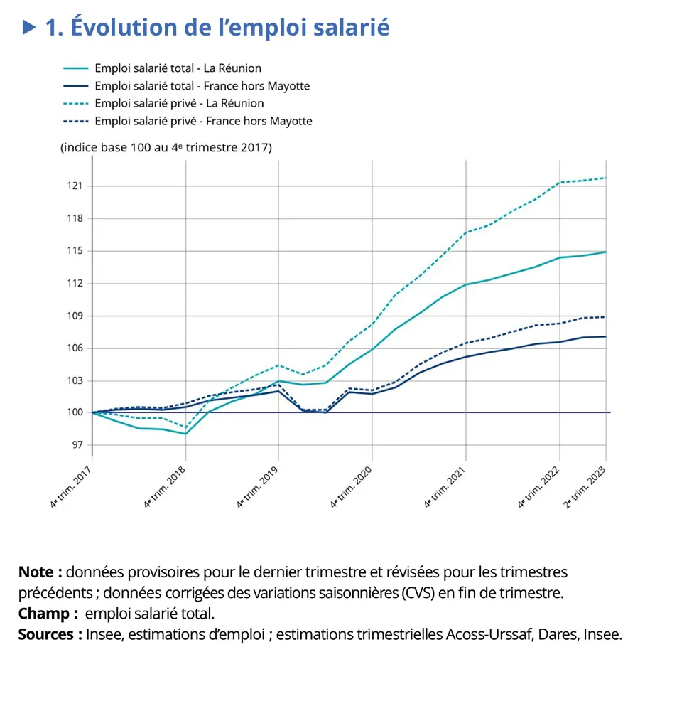Fin juin 2023, 291 800 salariés et salariées travaillent à La Réunion, secteurs privé et public confondus. Au 2e trimestre, le ralentissement de l’emploi salarié se confirme : alors que 1 600 emplois étaient créés en moyenne chaque trimestre en 2022, seuls 800 emplois sont créés au 2e trimestre (+0,3 %) après 500 emplois créés au 1er trimestre figure 1. Au niveau national, l’emploi ralentit lui aussi : les créations