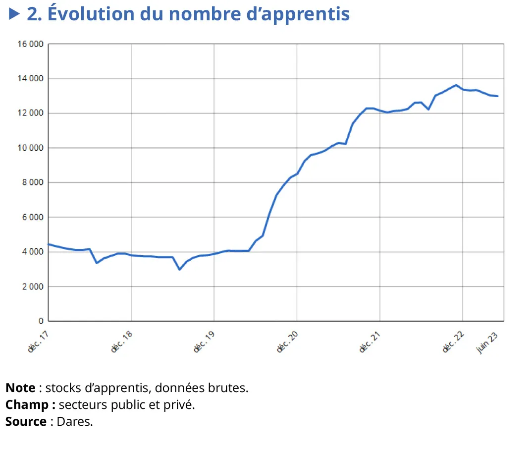 Au 2e trimestre 2023, l’emploi privé continue à ralentir par rapport à la dynamique observée en 2022 : un peu moins de 600 emplois sont créés (après 100 au 1er trimestre). En 2022, le secteur privé créait 2 000 emplois en moyenne chaque trimestre, en lien avec la dynamique des contrats d’apprentissage. Depuis le début d’année 2023, le recours aux contrats d’apprentissage diminue légèrement : en juin 2023, 13 000 personnes, jeunes pour la plupart, sont en apprentissage, soit 600 de moins qu’en fin d’année 2022 figure 2.