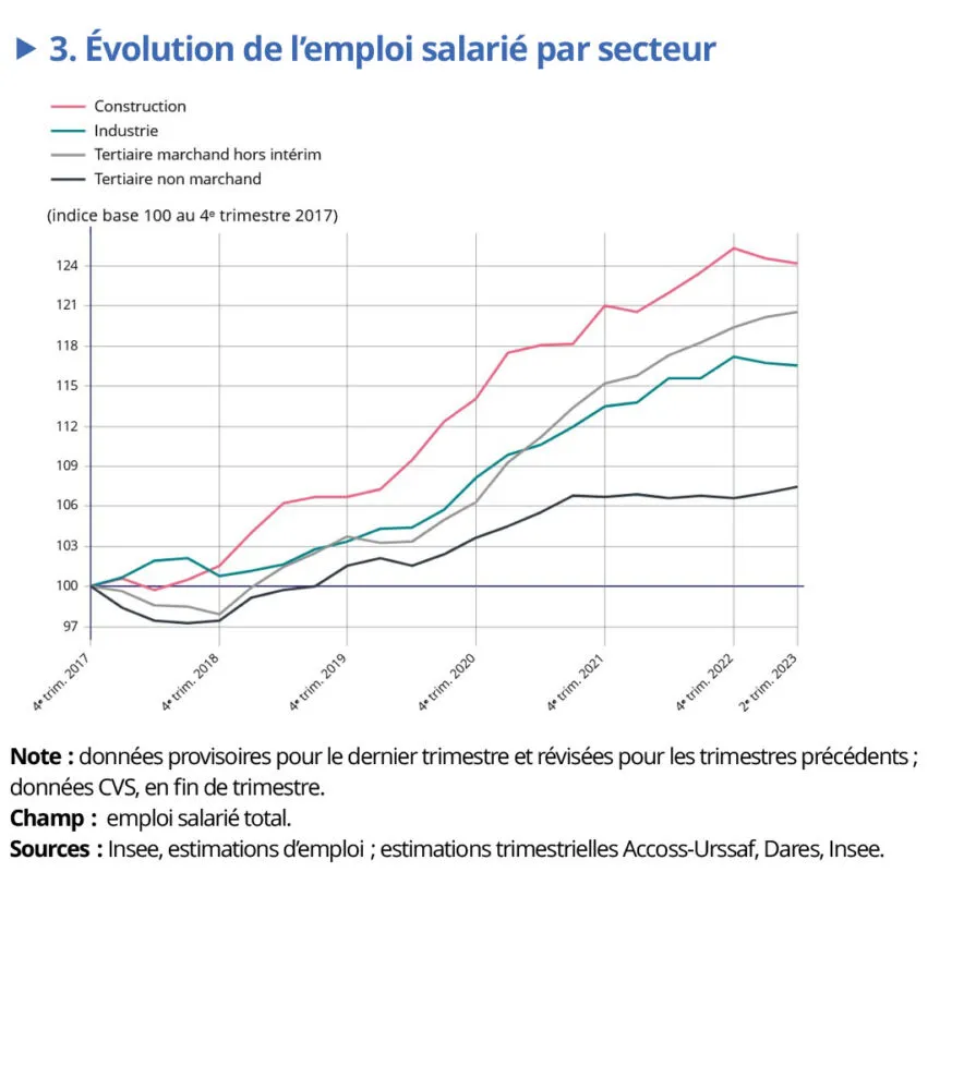 Ce trimestre, comme au trimestre précédent, l’emploi public progresse de 250 emplois Pourtant, le nombre de bénéficiaires de « Parcours emploi compétences » (PEC ) est stable depuis le début d’année 2023 : 10 100 personnes sont concernées en juin 2023. En 2022, 400 emplois publics étaient détruits chaque trimestre en moyenne, suite notamment à la baisse des PEC.