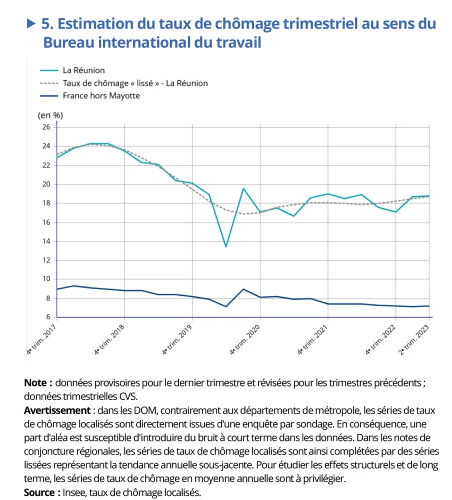 À La Réunion, au 2 e trimestre 2023, le taux de chômage au sens du Bureau international du travail (BIT) s’établit en moyenne à 19 % de la population active. Depuis deux ans, le chômage est quasi stable : il oscille entre 17 % et 19 %, à un niveau bien en deçà de sa valeur de fin 2018 (24 %) figure 5. Au niveau national, le chômage concerne 7,2 % de la population active au 2 e trimestre 2023.