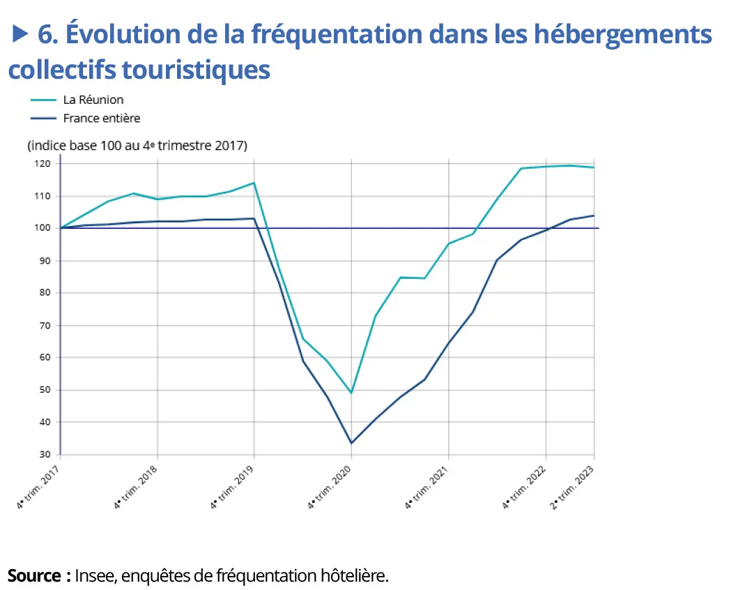 Avec 353 000 nuitées enregistrées, la fréquentation touristique dans les hôtels et autres hébergements collectifs touristiques baisse légèrement au 2e trimestre 2023 à La Réunion (-2 % par rapport au 2 e trimestre 2022) figure 6. Cette baisse, plus prononcée en juin, est liée au recul de l’offre de chambres (-3,2 %) et à la stabilisation du taux d’occupation à 64 %. La fréquentation touristique reste toutefois supérieure à son niveau du 2e trimestre 2019, avant la crise sanitaire.