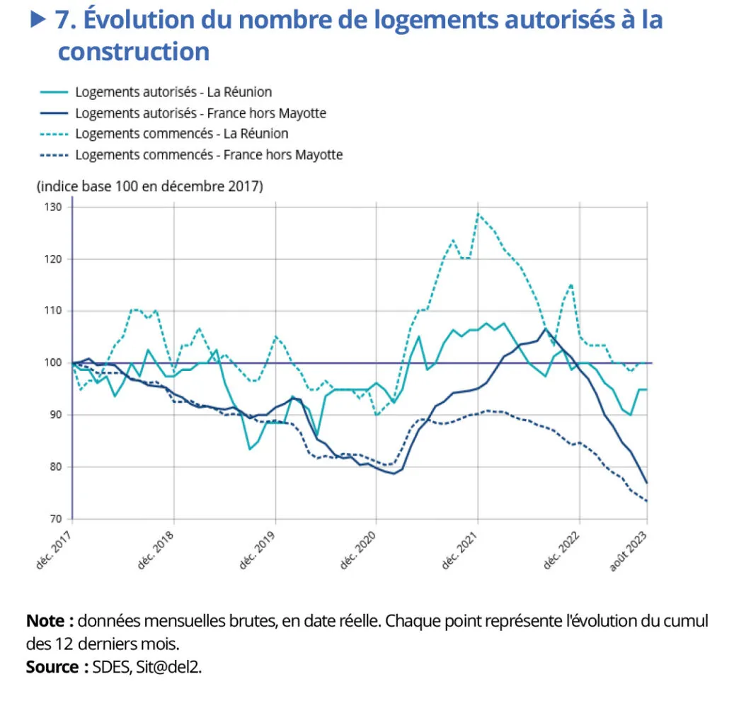 À La Réunion, 5 800 logements sont mis en chantier entre juillet 2022 et juin 2023, soit 1 000 de moins par rapport à la même période un an plus tôt (-15 %). Au niveau national, les mises en chantier diminuent également (-15 %) et concerne comme à La Réunion les logements collectifs et individuels.