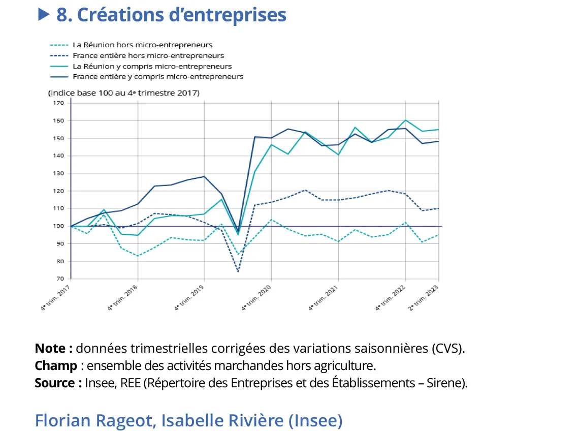 Au 2e trimestre 2023, les créations d’entreprises individuelles sous le régime de micro-entrepreneur représentent 57 % des créations d’entreprises, soit une part moins élevée qu’au niveau national (63 %). Ces créations reculent de 2,2 % par rapport au 1er trimestre 2023, alors qu’elles progressent légèrement en France (+0,7 %). Quant aux créations d’entreprises hors micro- entrepreneur, elles augmentent ce trimestre à la fois à La Réunion (+4,5 %) et en France (+1,1 %).