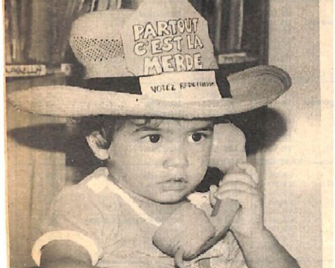 C’est J.R. Grand Naze qui est la tête de liste ! Le petit garçon que vous voyez sur la photo avec un chapeau « partout c’est la merde » n’est autre que le fils de Fred Dargaud (GAGS Animation). À