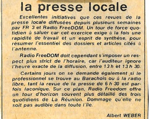 Albert Weber (le Quotidien) a assisté à l’émission « allons Z’enfants » avec Alain, Solange, Mathieu et Delphine… Dès le départ, Radio Free Dom émettait 24 h/24, toute la nuit, et le soir l’émission s’appelait Carbone 14 (quelques mois avant « Chaleur Tropicale »),