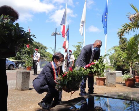 Le Maire du Tampon, André Thien Ah Koon, accompagné de Mme Augustine Romano et de M. Enaud Rivière, respectivement vice-présidente et vice-président du Conseil départemental, et son Conseil municipal ont célébré le 75ème anniversaire de la départementalisation ce vendredi 19