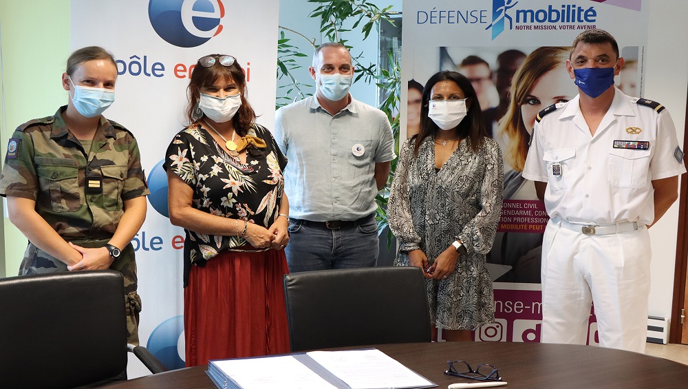 Angélique GOODALL, Directrice régionale de Pôle emploi Réunion et l’adjudant Sébastien, chef d’antenne de Défense Mobilité à La Réunion ont signé le renouvellement d’une convention cadre qui a été déclinée et également renouvelée au niveau régionale, entre Pôle emploi Réunion
