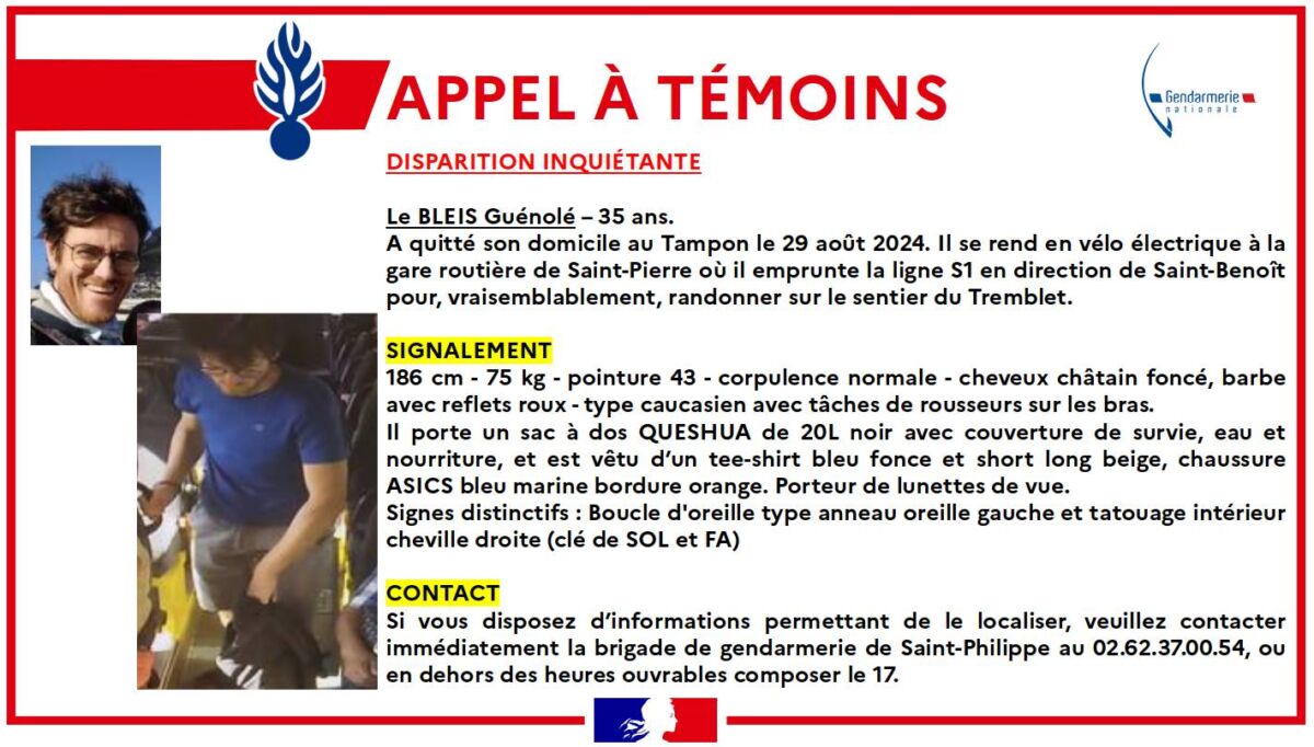 Selon les informations disponibles, Guénolé a quitté son domicile au Tampon à vélo électrique pour se rendre à la gare routière de Saint-Pierre, où il a pris la ligne S1 en direction de Saint-Benoît, avec l’intention de randonner. Les autorités ont lancé un appel à témoins et sollicitent l’aide de toute personne ayant des informations qui pourraient aider à localiser le randonneur.