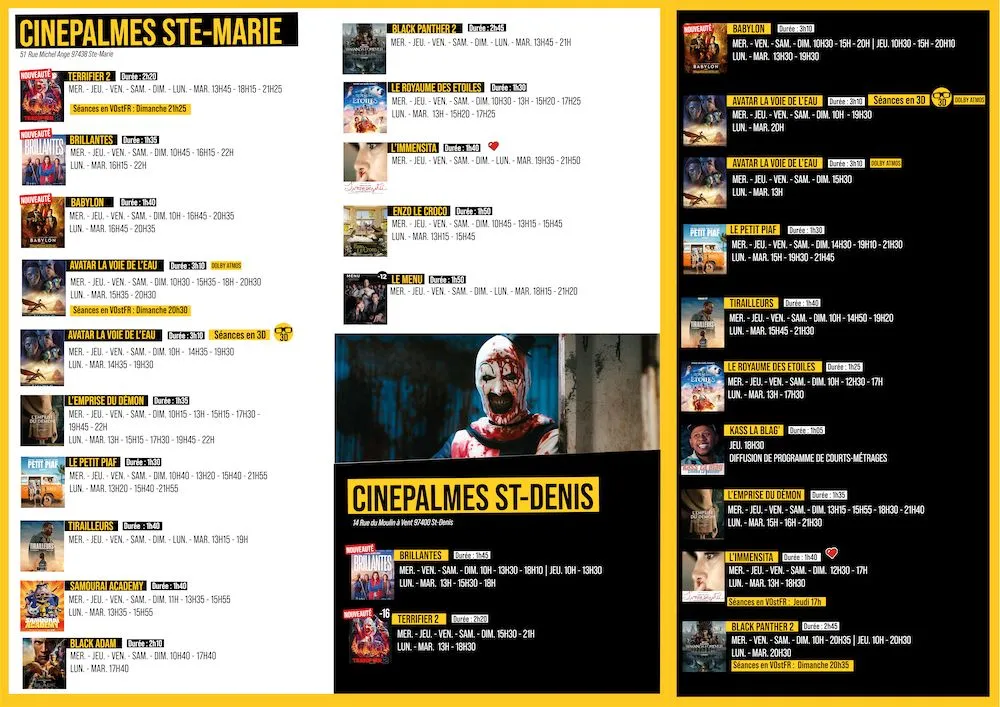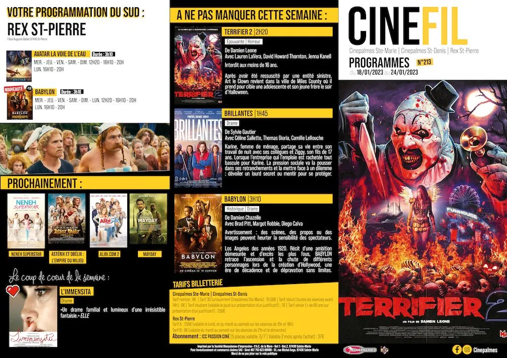 – TERRIFIER 2 : Après avoir été ressuscité par une entité sinistre, Art le Clown revient dans la ville de Miles County où il prend pour cible une adolescente et son jeune frère le soir d’Halloween.
