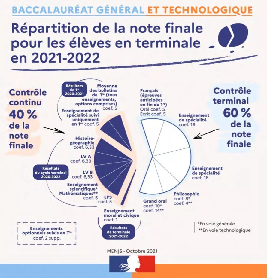 Depuis la réforme du baccalauréat en 2019, la note du baccalauréat repose à 40% sur du contrôle continu et à 60% sur des épreuves terminales (le français écrit et oral, passé en classe de Première, la philosophie, les épreuves de spécialités et le grand oral, passés en Terminale).