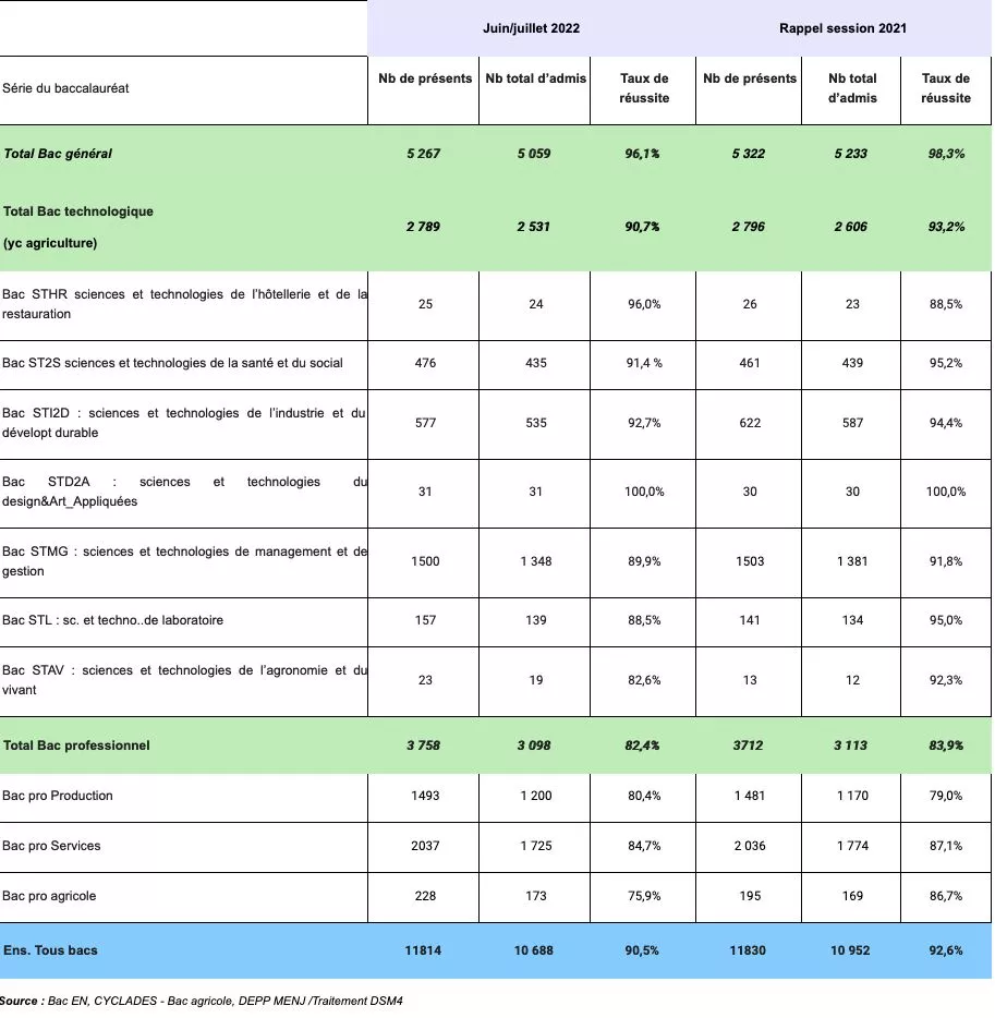Le taux d’admis pour le baccalauréat général est de 96,1 % en baisse de 2,3 points par rapport à 2021. Il est cette année équivalent à celui de la métropole, qui s’établit également à 96,1 % (contre 94 % en 2021).
