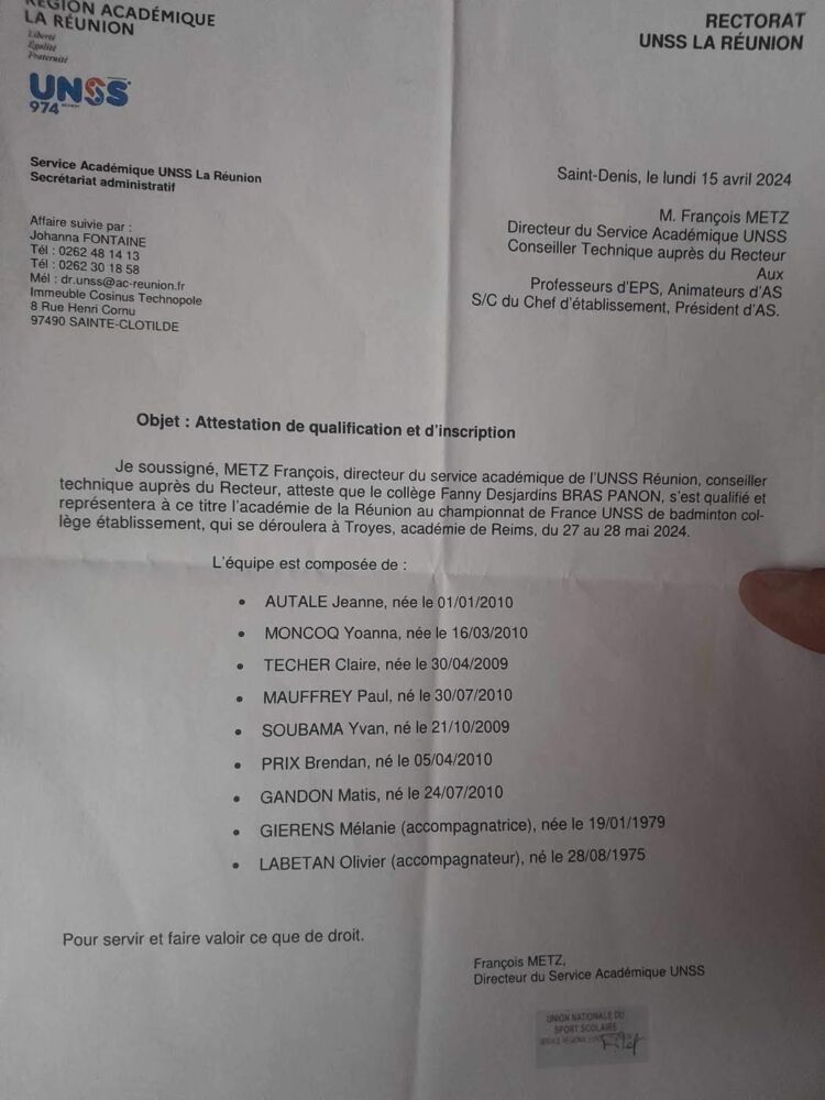 Avec humilité, le collège de Bras-Panon aborde désormais les Championnats de France de Badminton UNSS. « C’est avec gratitude et détermination que nous représenterons l’Association Sportive du collège, la ville de Bras-Panon et l’île de La Réunion », expliquent les élèves qualifiés qui sont : Claire Techer, Yohanna Moncoq, Jeanne Autale, Matis Gandon, Brendan Prix, Yvan Soubama et Paul Mauffrey (en tant que jeune arbitre), se préparent avec sérieux et détermination pour cette nouvelle aventure.