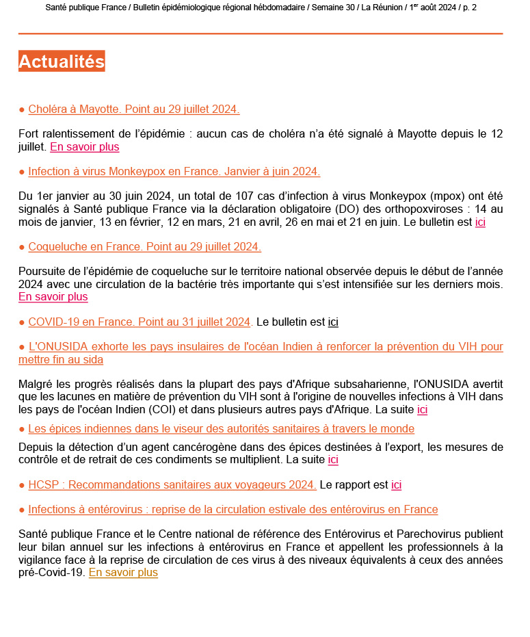 Le point épidémiologique régional pour la semaine 30, couvrant la période du 22 au 28 juillet 2024, révèle des tendances positives en matière de santé publique.