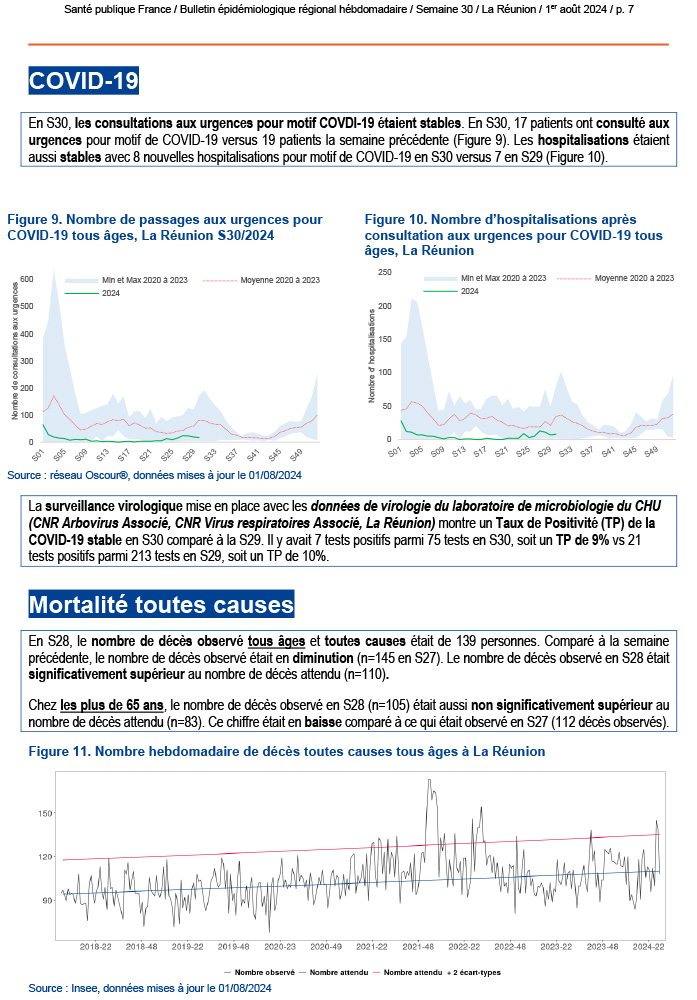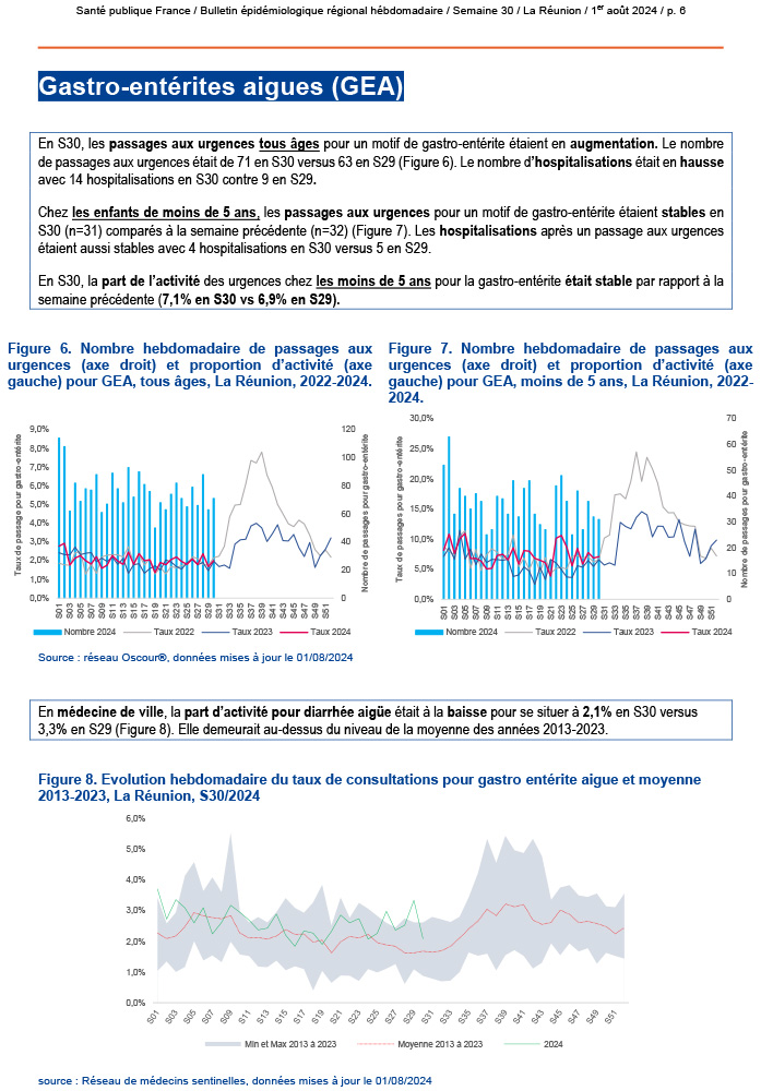 La circulation des virus responsables des infections respiratoires aiguës (IRA) est en baisse, indiquant une diminution de la prévalence de ces infections. Les passages aux urgences pour des gastro-entérites aiguës (GEA) sont restés stables au cours des trois dernières semaines, montrant une situation contrôlée sans augmentation significative des cas. En ce qui concerne le COVID-19, la circulation du Sars-Cov2 est faible et l’impact sanitaire limité.