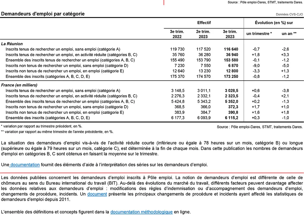 À La Réunion, le nombre moyen d’entrées en catégories A, B, C au troisième trimestre 2023 diminue de 1,1 % par rapport au trimestre précédent (+4,3 % sur un an).