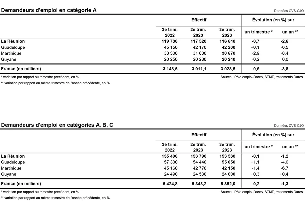 Au troisième trimestre 2023, dans les départements-régions d’Outre-mer, les évolutions sur le trimestre du nombre de demandeurs d’emploi en catégorie A se situent entre –2,9 % en Martinique et +0,1 % en Guadeloupe. Sur un an, elles se situent entre –8,4 % en Martinique et 0,0 % en Guyane.