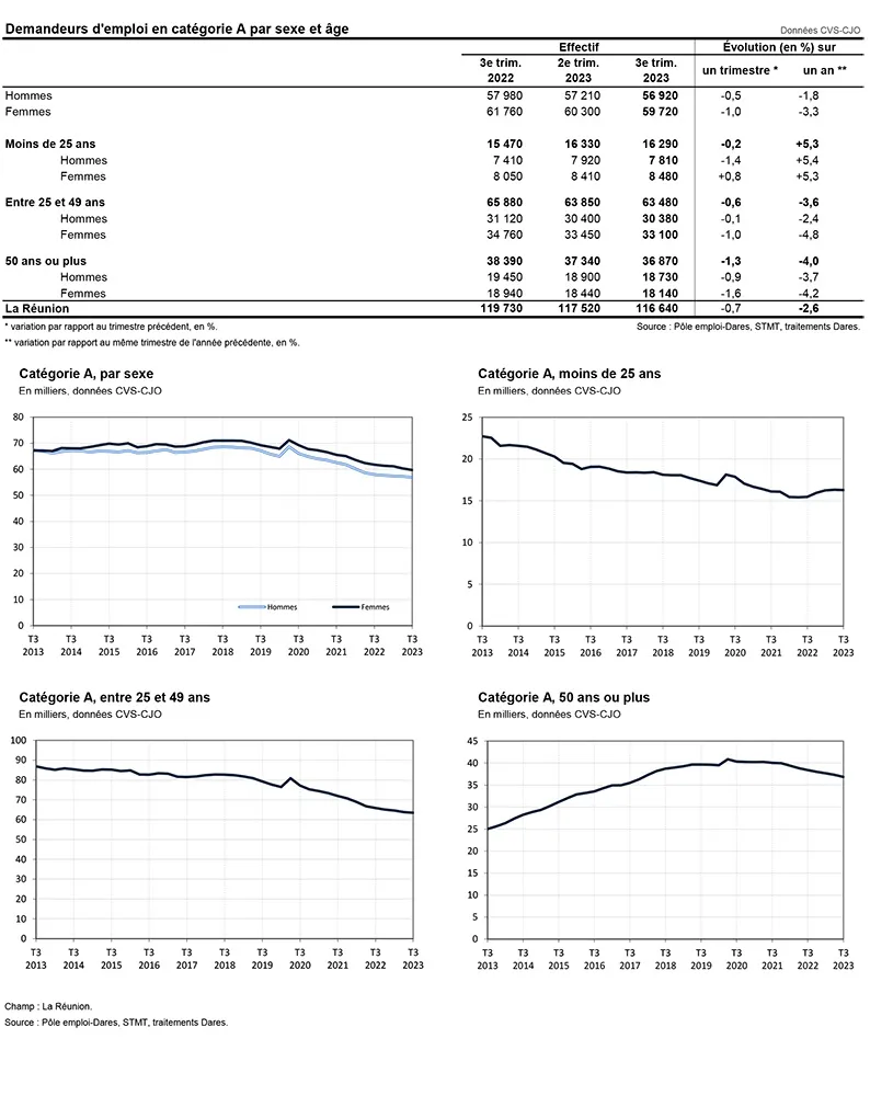 Sur un trimestre, le nombre de demandeurs d’emploi en catégorie A diminue à La Réunion de 0,2 % pour les moins de 25 ans (+5,3 % sur un an), de 0,6 % pour ceux âgés de 25 à 49 ans (–3,6 % sur un an) et de 1,3 % pour ceux âgés de 50 ans ou plus (–4,0 % sur un an).