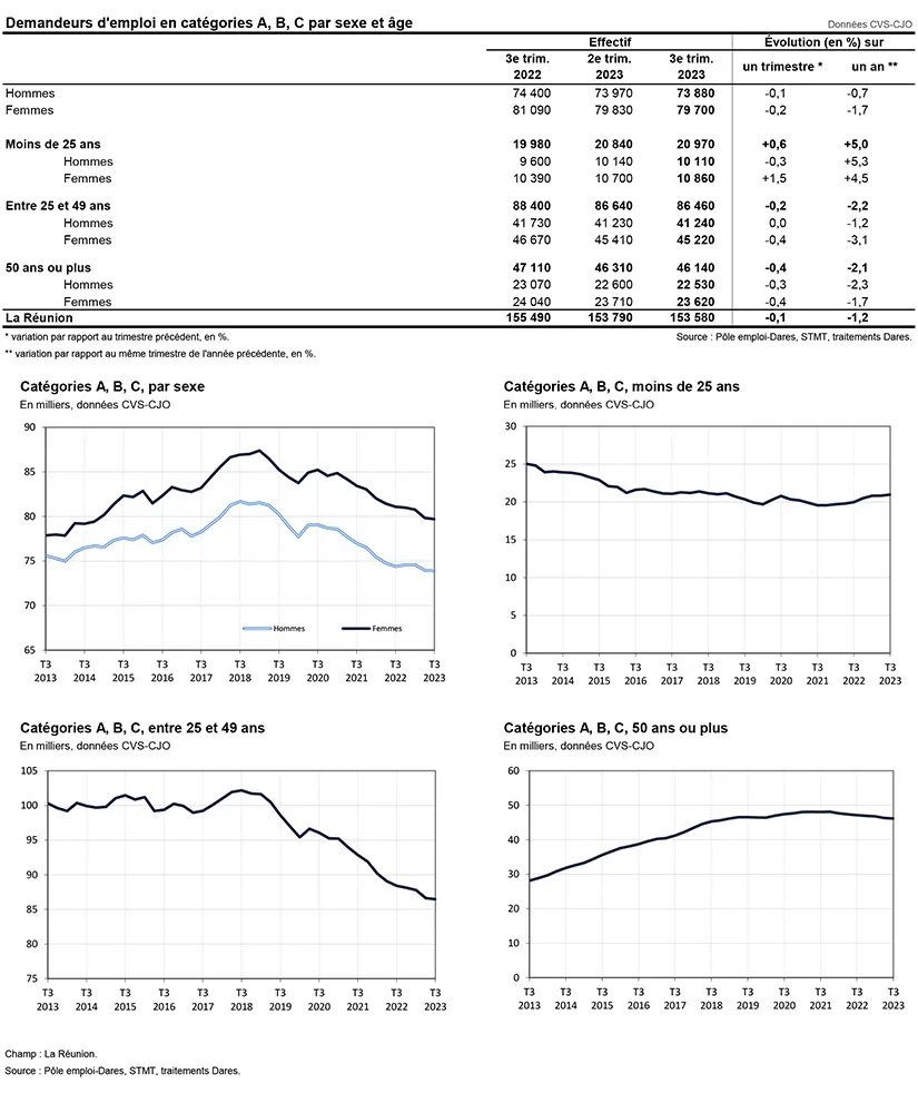 Sur un trimestre, le nombre de demandeurs d’emploi en catégories A, B, C augmente à La Réunion de 0,6 % pour les moins de 25 ans (+5,0 % sur un an), recule de 0,2 % pour ceux âgés de 25 à 49 ans (–2,2 % sur un an) et de 0,4 % pour ceux âgés de 50 ans ou plus (–2,1 % sur un an).