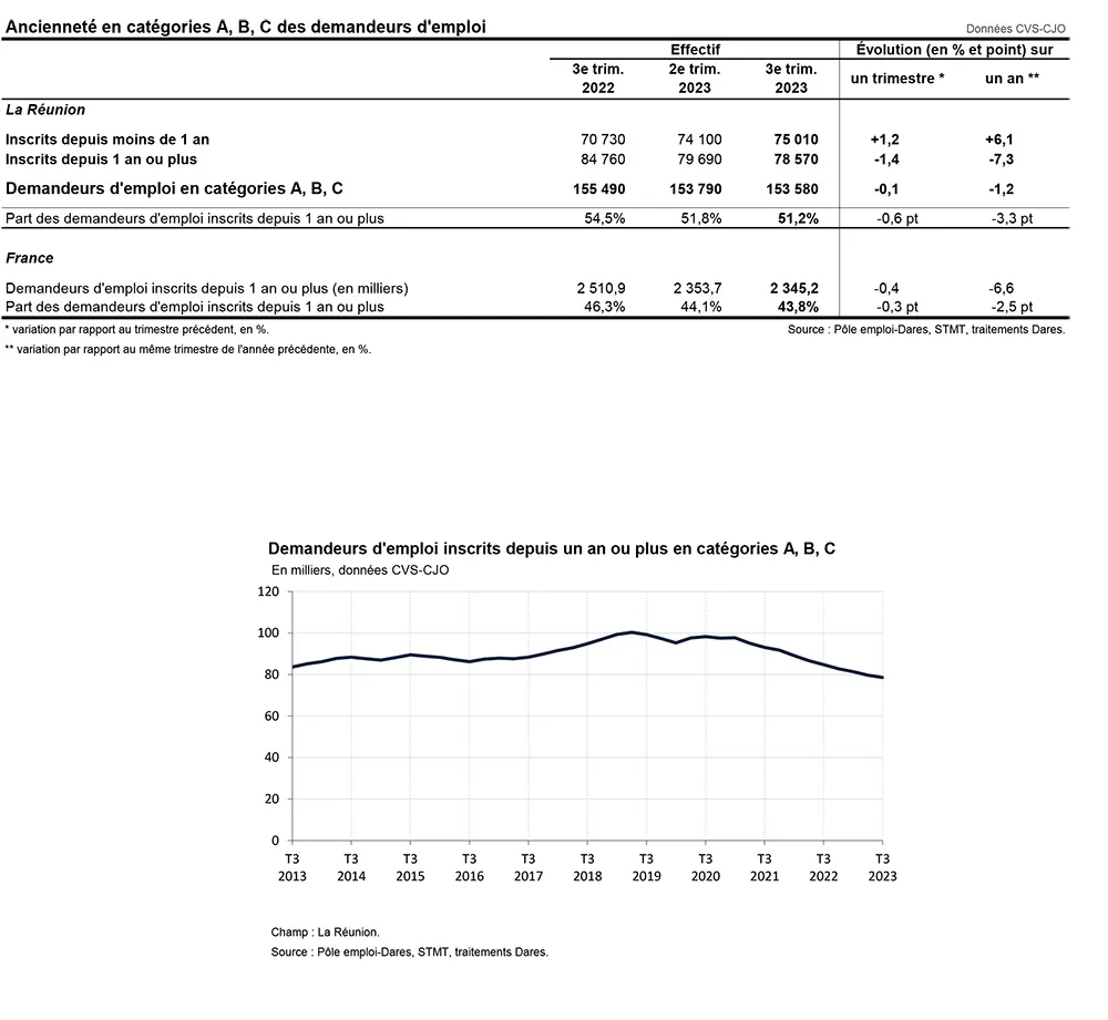 À La Réunion, sur un trimestre, le nombre de demandeurs d’emploi inscrits en catégories A, B, C depuis un an ou plus diminue de 1,4 % (–7,3 % sur un an) tandis que celui des inscrits depuis moins d’un an progresse de 1,2 % (+6,1 % sur un an).