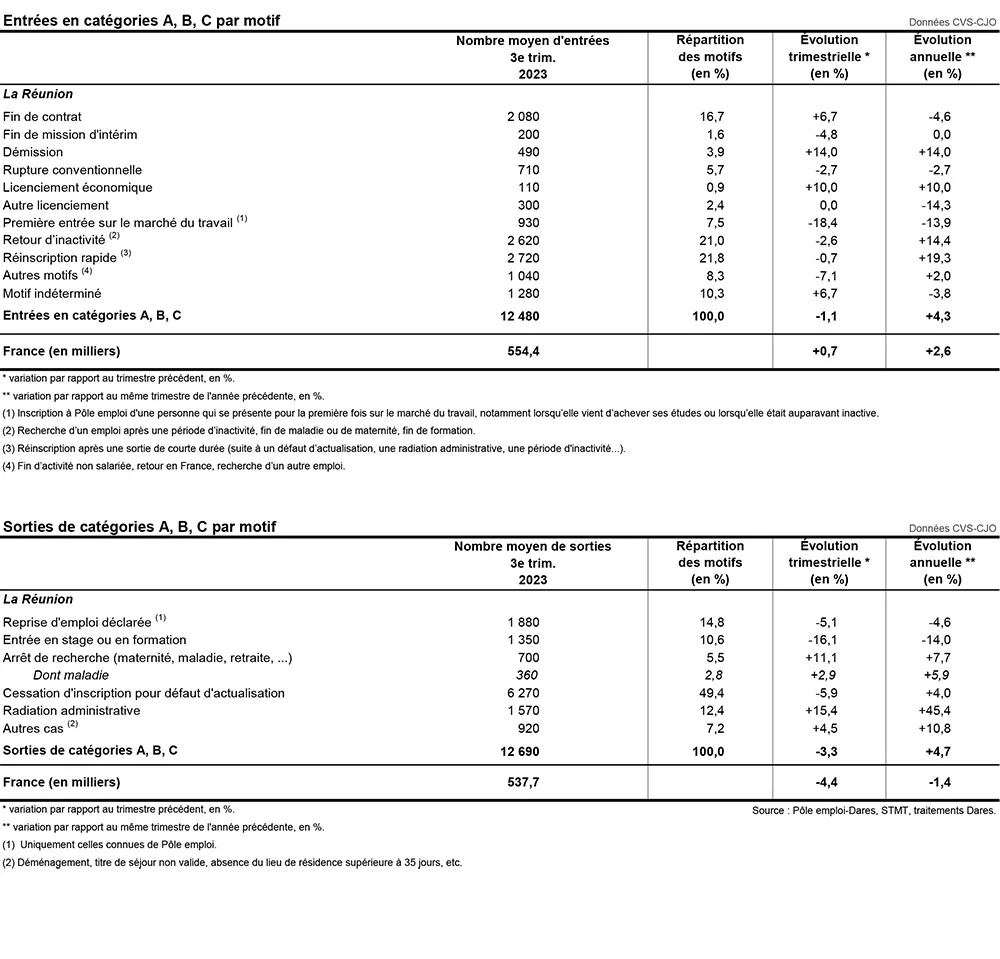 À La Réunion, le nombre moyen de sorties de catégories A, B, C au troisième trimestre 2023 diminue de 3,3 % par rapport au trimestre précédent (+4,7 % sur un an).