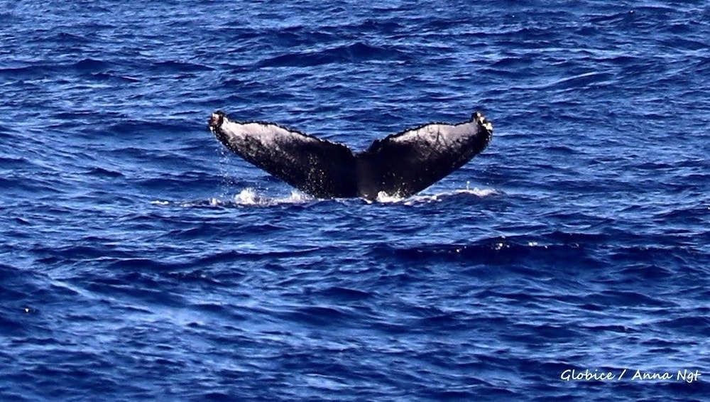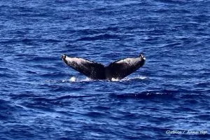 « Malgré une mer agitée la première photo-identification de caudale de Baleine à bosse de la saison 2022 à La Réunion a pu être réalisée par la bénévole Anna Nguyen Thaï embarquée sur Croisières et Découvertes, le Grand Bleu.