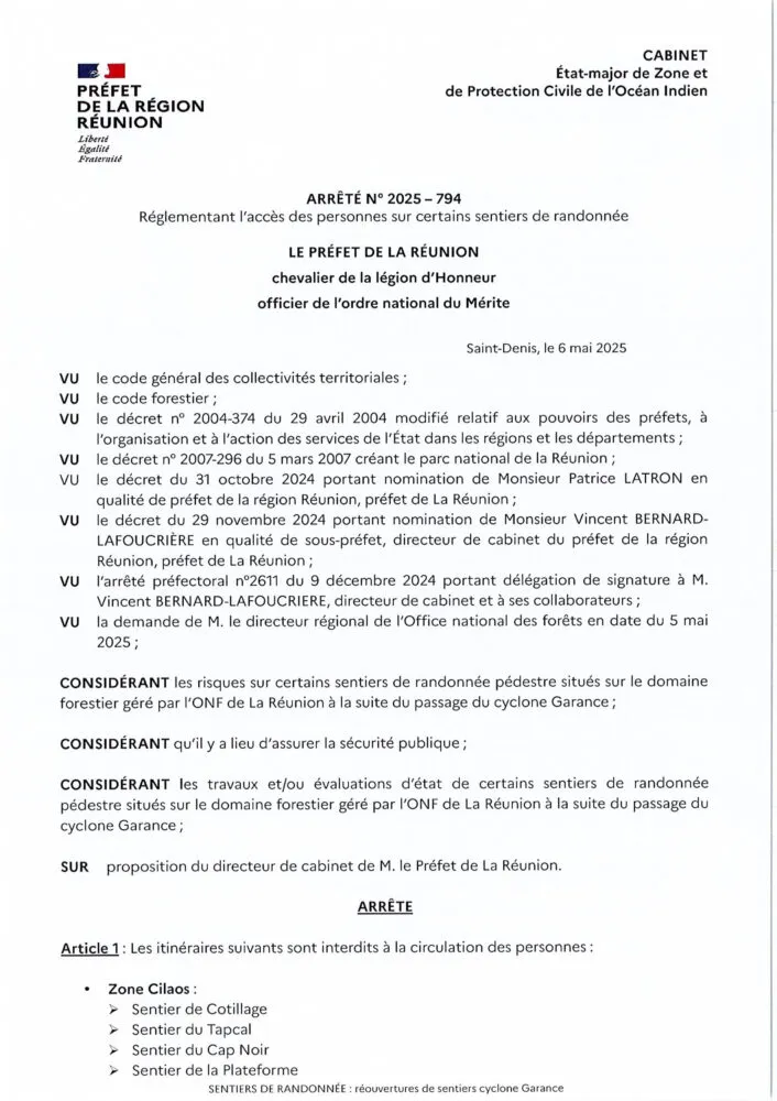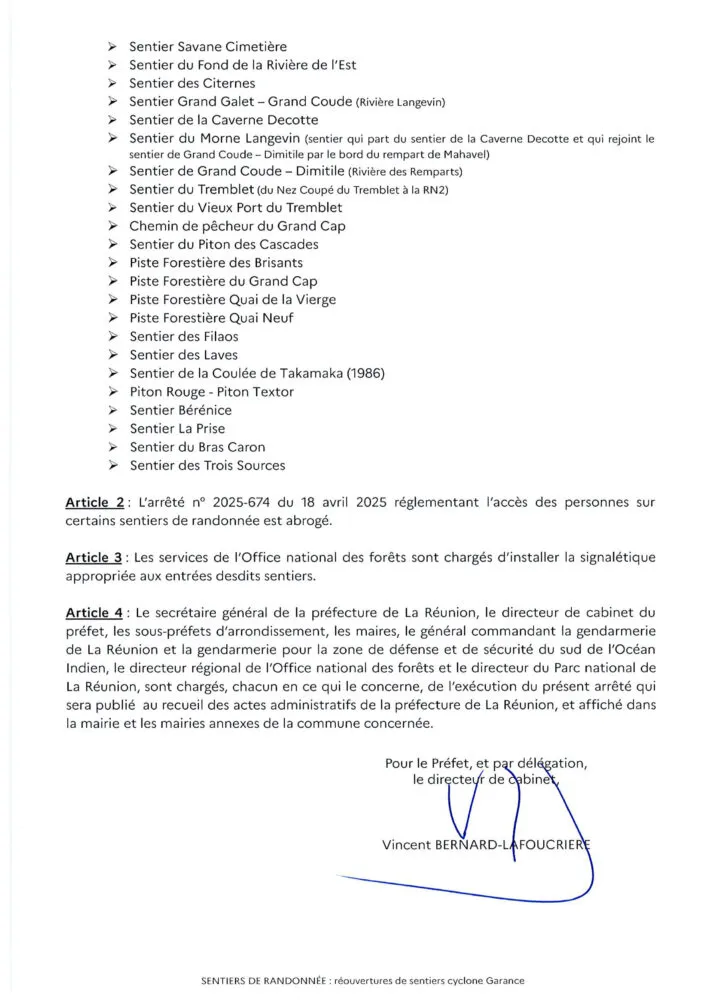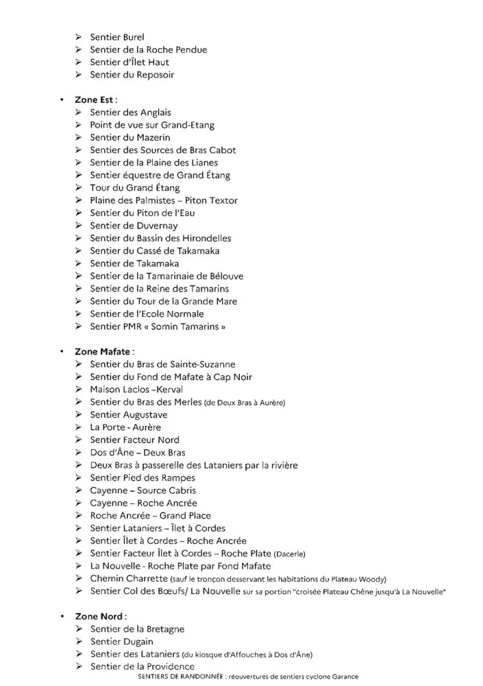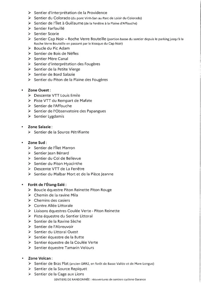 Suite aux travaux réalisés par les équipes de l’ONF de La Réunion après le passage du cyclone Garance, certains sentiers peuvent être rouverts. C’est le cas notamment des sentiers littoraux de Basse Vallée et de Saint-Philippe, des Rampes de la Montagne (sentier de la Vigie) ou encore du sentier de la Cascade Blanche.