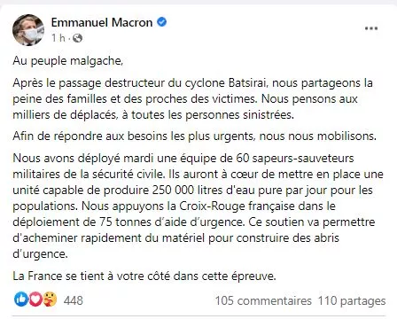 Sur les réseaux sociaux, le président français, Emmanuel Macron s’est adressé aux Malgaches, plus particulièrement aux victimes du passage de Batsirai. Il a indiqué que « La France se tient à votre côté dans cette épreuve » qui fait plus d’une centaine de morts et des centaines de milliers de sinistrés, selon le bilan établi localement.