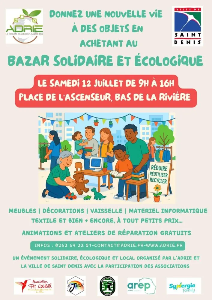 Le samedi 12 juillet 2025, la Place de l’Ascenseur, au Bas de la Rivière à Saint-Denis, accueillera un événement solidaire d’un genre nouveau : le Bazar solidaire et écologique organisé par l’Adrie, en partenariat avec la Ville de Saint-Denis et plusieurs associations locales.
