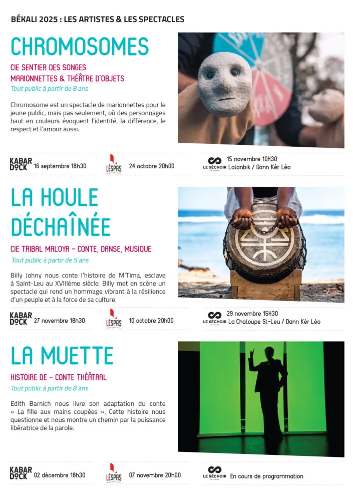 « Tribal Maloya » (Récit -Danse – musique) | « Histoire de… » (Théâtre) | « Le sentier des Songes » (Marionnette), les lauréats Békali 2024-2025, sont en représentation depuis le mois de septembre et jusqu’en décembre dans les salles partenaires