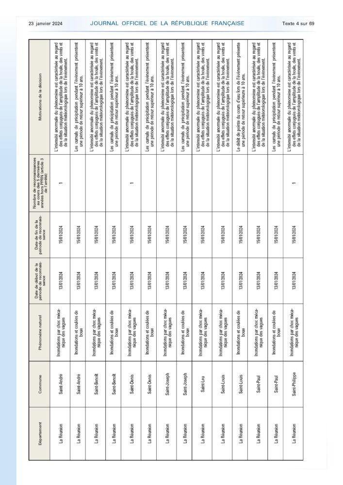 Aux termes de la commission interministérielle CATNAT du vendredi 19 janvier, chargée d’évaluer le caractère exceptionnel et anormal d’un phénomène [1], chaque communede l’île bénéficie de la reconnaissance « catastrophe naturelle » pour au moins un des 3 motifs. L’arrêté de ce jour précise les communes et phénomènes naturels reconnus, les périodes de reconnaissance et les motivations des décisions adoptées :
