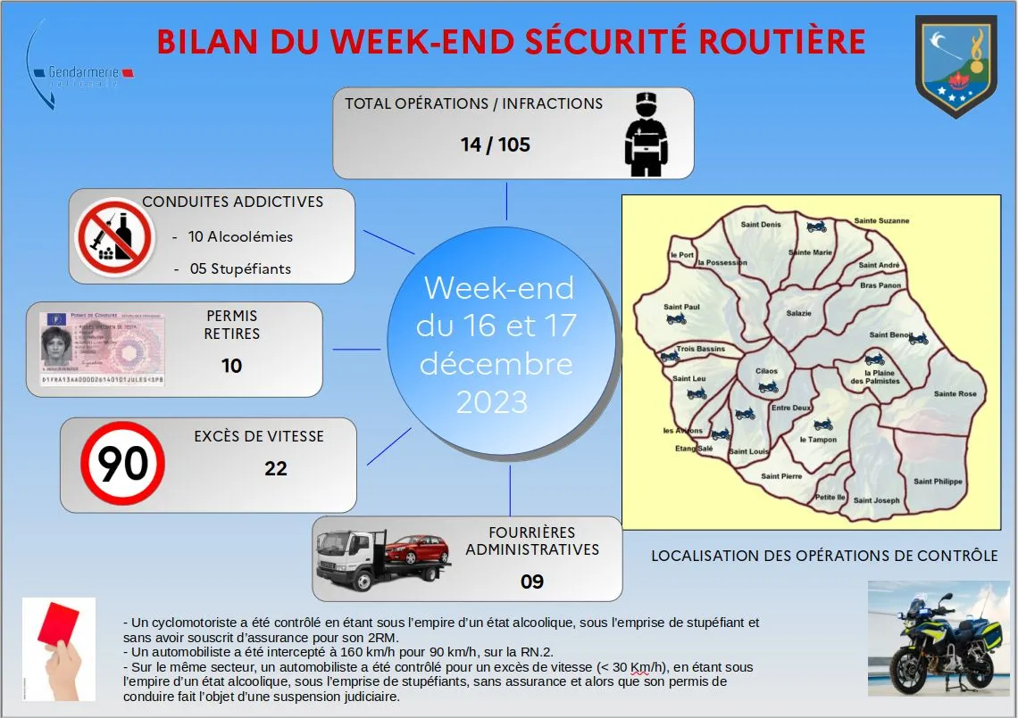 Les effectifs de la Direction Territoriale de Police Nationale de La Réunion ont mené 21 opérations de sécurisation et de sécurité routière au cours du week-end du 15 au 17 décembre 2023, aboutissant à la constatation de 75 infractions, dont 10 délits. Ces infractions se répartissent comme suit :