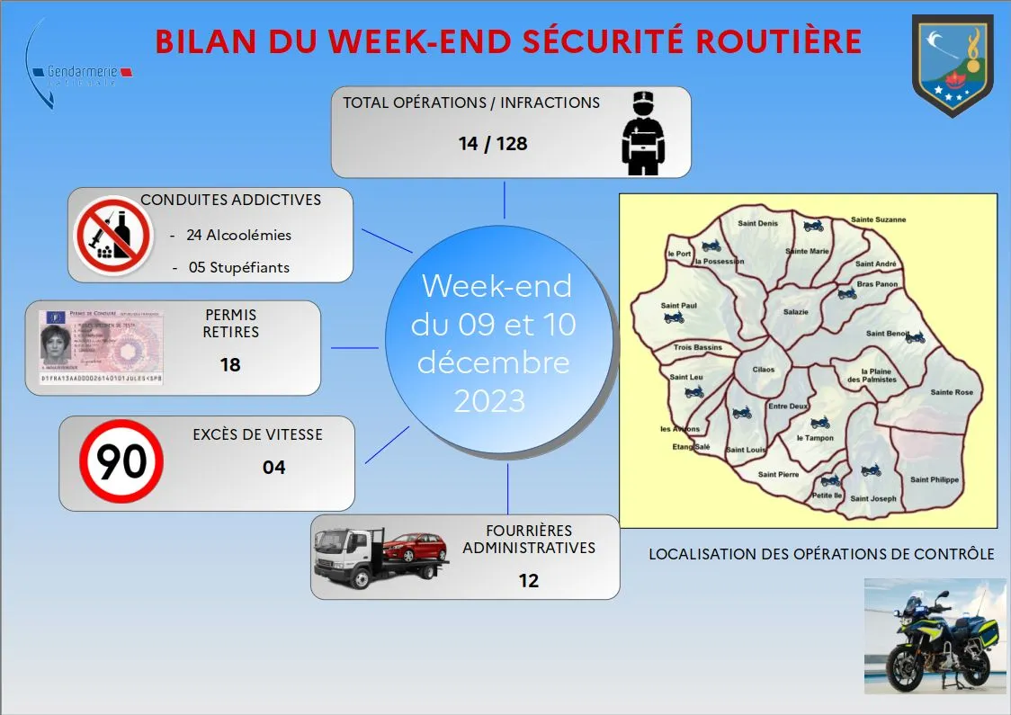 Les effectifs de la Direction Territoriale de Police Nationale de La Réunion ont réalisé, sur le département, 14 opérations de sécurisation et de sécurité routière au cours de ce week-end du 8 au 10 décembre 2023, permettant de relever 136 infractions, dont 10 délits :