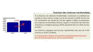 Un autre constat préoccupant concerne l’augmentation des violences intra-familiales. En 2023, les faits de VIF connaissent une hausse de 17% par rapport à 2022. La proportion des violences intrafamiliales (VIF) par rapport à l’ensemble des atteintes volontaires à l’intégrité physique (AVIP) représente 49 % en 2023 comme en 2022.