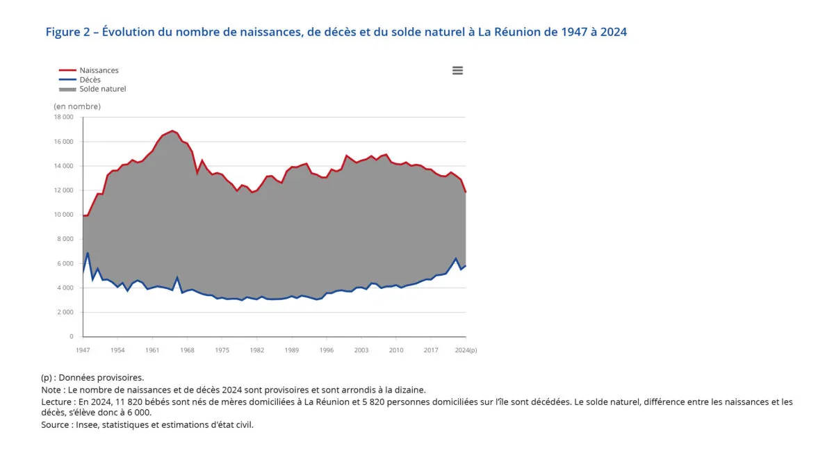 Le solde naturel, différence entre les naissances et les décès, continue de porter la croissance démographique réunionnaise. Il s’établit à +6 000 en 2024 (figure 2). En baisse régulière depuis 2012, il atteint en 2024 son plus bas niveau depuis la fin des années 1940.